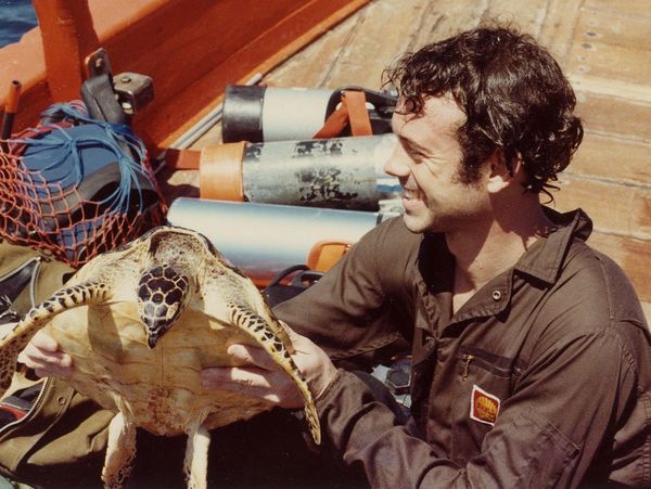 Mr. White as he looked in 1975, scuba diving in the Similan Islands not long after the fall of Saigon. The Andaman Sea green sea turtle, Chelonia mydas, is a protected species and the author released it unharmed.